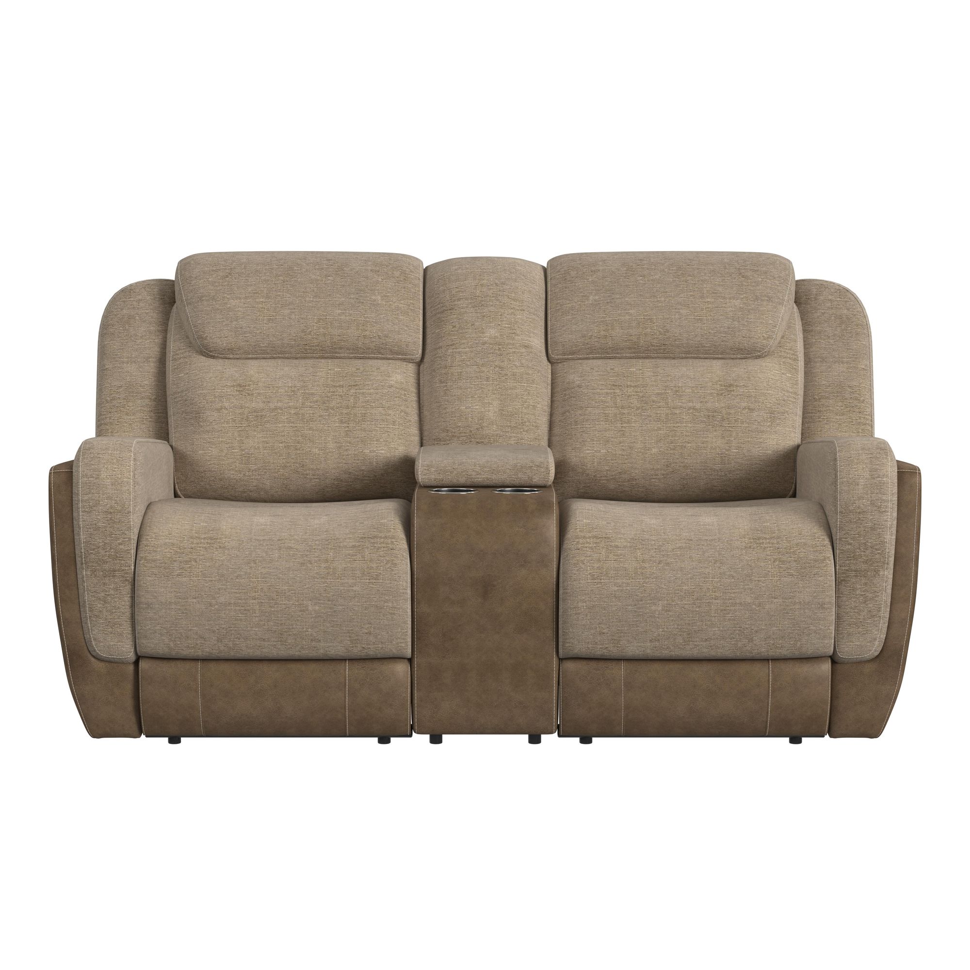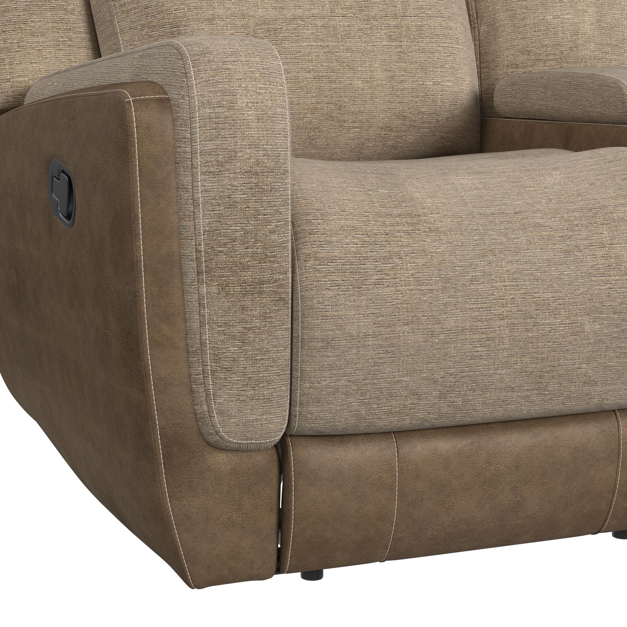 Experience unmatched comfort and convenience with the Hornet Rancho Beige Motion Loveseat. Designed with two-tone fabric upholstery, it offers a stylish, contemporary look that complements any living space. The manual reclining mechanism allows for easy adjustment to your perfect lounging position, while steel springs and foam cushions provide long-lasting support. Sink into plush, cushioned seats, backrests, and armrests, ensuring maximum comfort for extended seating. The wide, sturdy armrests add extra support, creating a truly relaxed sitting experience. Plus, the center console features built-in cup holders and storage, making it the ideal spot for unwinding with all your essentials close at hand.