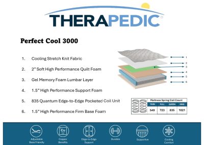 Sleep in luxury with the Perfect Cool 3000 mattress. This mattress is wrapped with a cooling stretch knit fabric that provides a cool-to-touch sensation. The High-Performance quilt foam layer provides increased comfort, while the Gel memory foam lumbar layer provides exceptional support. A superior high-density foam provides exceptional resilience and breathable pressure relief. The Quantum Edge Individually encased coils provide consistent support, right up to the edge of the mattress!
